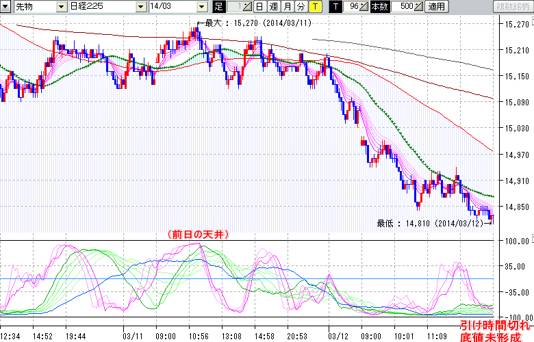 2014/03/12 - tensokoさんの株式ブログ。タイトル:「★3/11 夜間の株価の底値★」 本文:★3/11 夜間の株価の底値★ ↓クリックで画像拡大↓ ※指標ラインの密集点が天底・転換点を示します。指標の見方日経225large先物チャート : 48ティック足底値 :