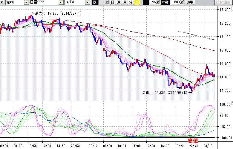 2014/03/13 - tensokoさんの株式ブログ。タイトル:「★3/12 夜間の株価の底値★」 本文:★3/12 夜間の株価の底値★ ↓クリックで画像拡大↓ ※指標ラインの密集点が天底・転換点を示します。指標の見方日経225large先物チャート : 96ティック足底値 : 14680 (3/12