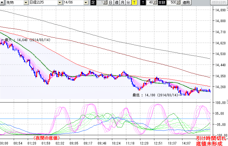 2014/03/14 - tensokoさんの株式ブログ。タイトル:「★3/14 日中の株価の底値★」 本文:★3/14 日中の株価の底値★ ↓クリックで画像拡大↓ ※指標ラインの密集点が天底・転換点を示します。指標の見方日経225large先物チャート : 48ティック足底値 :