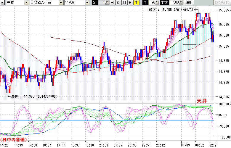 2014/04/03 - tensokoさんの株式ブログ。タイトル:「★4/2 夜間の株価の天井★」 本文:★4/2 夜間の株価の天井★ ↓クリックで画像拡大↓ ※指標ラインの密集点が天底・転換点を示します。指標の見方日経225mini先物チャート : 96ティック足天井 : 15055 (4/3