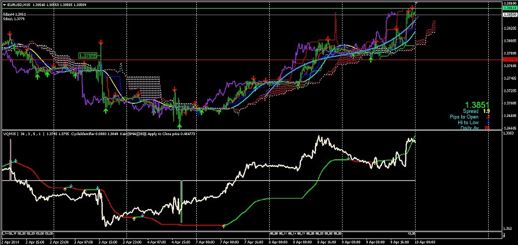 2014/04/10 - けろけろさんの株式ブログ。タイトル:「2014-04-10 15分足」 本文:昨日までの動き左から (チャートの時間は7時間程度遅れてます)--ユーロドル-- --ユーロ・円--