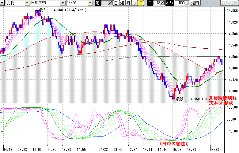 2014/04/23 - tensokoさんの株式ブログ。タイトル:「★4/22 夜間の株価の天底★」 本文:★4/22 夜間の株価の天底★ ↓クリックで画像拡大↓ ※指標ラインの密集点が天底・転換点を示します。指標の見方日経225large先物チャート : 48ティック足天井 :