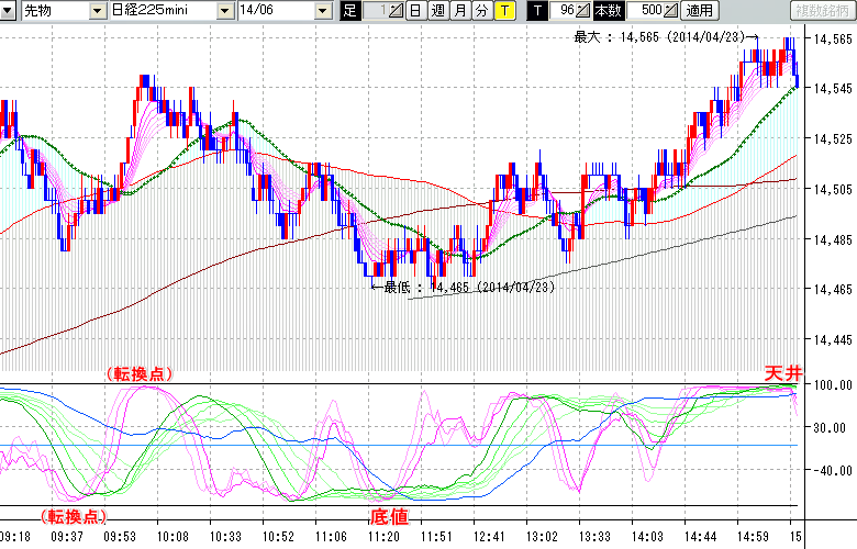 2014/04/23 - tensokoさんの株式ブログ。タイトル:「★4/23 日中の株価の天底★」 本文:★4/23 日中の株価の天底★ ↓クリックで画像拡大↓ ※指標ラインの密集点が天底・転換点を示します。指標の見方日経225mini先物チャート : 96ティック足底値 : 14465 (4/23