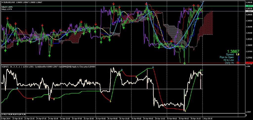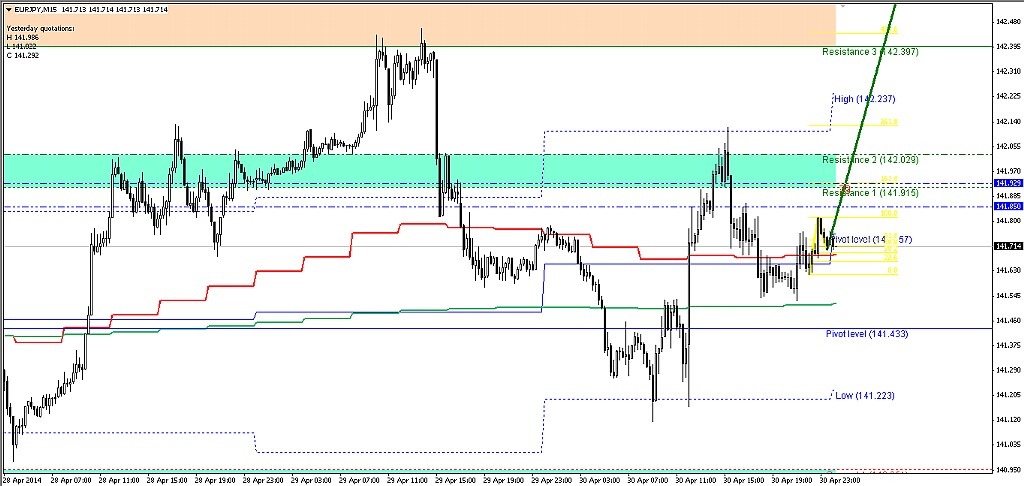 2014/05/01 - けろけろさんの株式ブログ。タイトル:「2014-05-01 15分足」 本文:昨日までの動き左から (チャートの時間は7時間程度遅れてます)--ユーロドル-- --ユーロ・円--