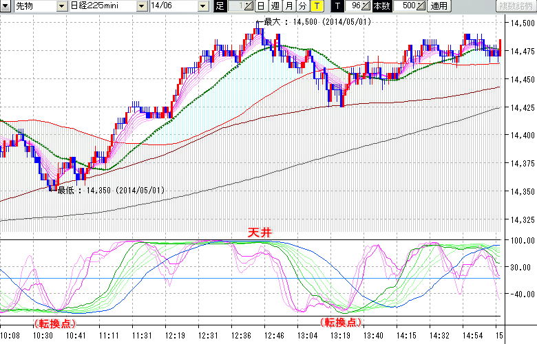 2014/05/01 - tensokoさんの株式ブログ。タイトル:「★5/1 日中の株価の天井★」 本文:★5/1 日中の株価の天井★ ↓クリックで画像拡大↓ ※指標ラインの密集点が天底・転換点を示します。指標の見方日経225mini先物チャート : 96ティック足天井 : 14500 (5/1