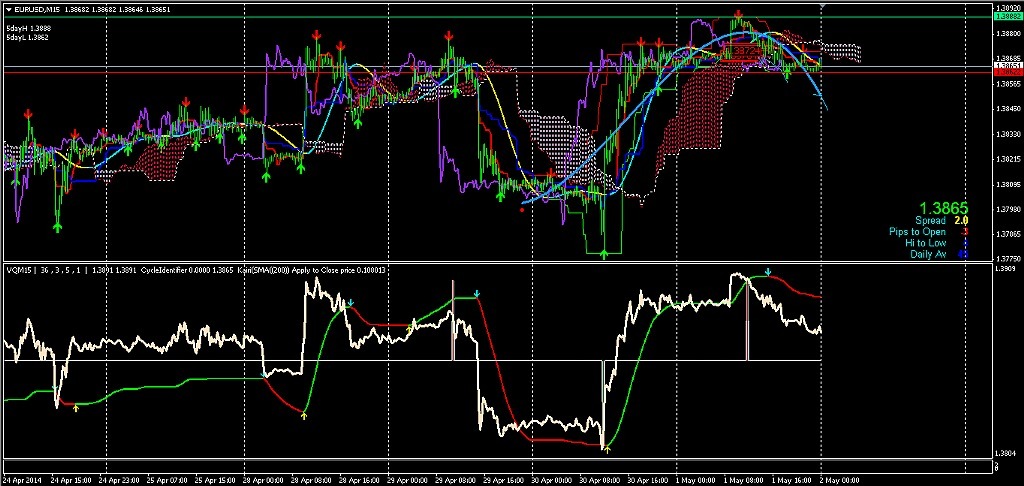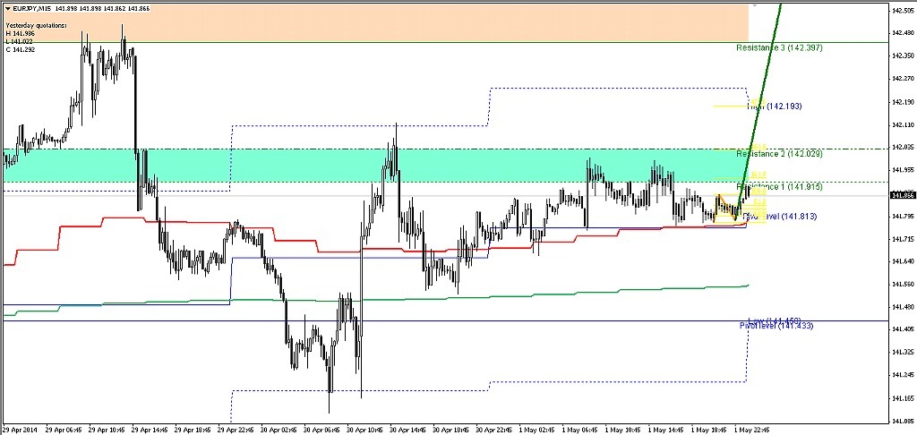 2014/05/02 - けろけろさんの株式ブログ。タイトル:「2014-05-02 15分足」 本文:昨日までの動き左から (チャートの時間は7時間程度遅れてます)--ユーロドル-- --ユーロ・円--