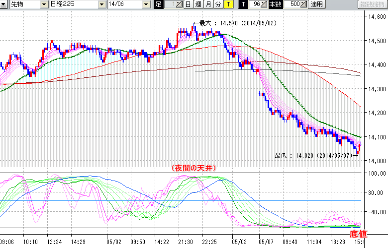 2014/05/07 - tensokoさんの株式ブログ。タイトル:「★5/7 日中の株価の底値★」 本文:★5/7 日中の株価の底値★ ↓クリックで画像拡大↓ ※指標ラインの密集点が天底・転換点を示します。指標の見方日経225large先物チャート : 96ティック足底値 : 14020 (5/7