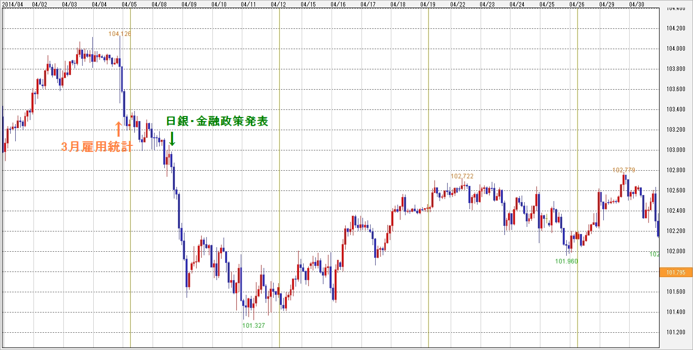 値幅はそこそこあって、1週目と2週目に大きく動いた感じですね。4月はまずは(米)3月雇用統計がやや弱めの結果となったことで下押しされ、さらに翌週の(日)日銀・金融政策発表と黒田日銀総裁記者会見で、追加緩和期待が大きく後退し、全体的に大きく円高に傾きました。