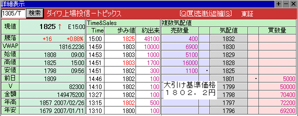 画像は、本日大引けの大和TOPIX-ETF(1305)の取引状況です。