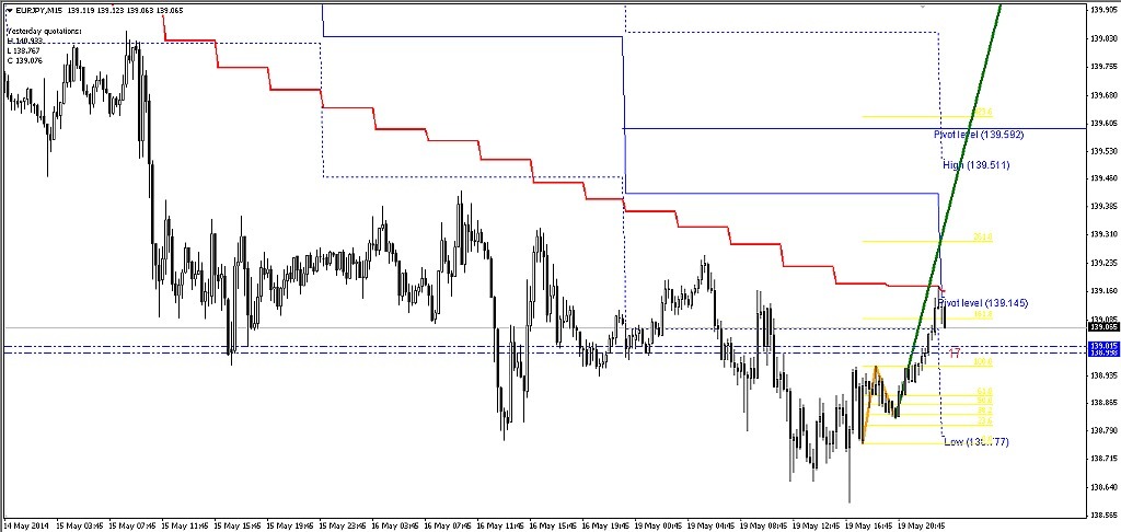 2014/05/20 - けろけろさんの株式ブログ。タイトル:「2014-05-20 15分足」 本文:昨日までの動き左から (チャートの時間は7時間程度遅れてます)--ユーロドル-- --ユーロ・円--