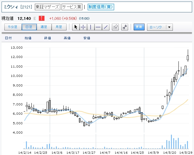 2014/05/31 - ゆきママさんの株式ブログ。タイトル:「ミクシィは第二のガンホーだった!損切りしてなければ…」 本文:ミクシィ(2121)がついにディー・エヌ・エー(2432)を時価総額で上回ったようです。ちなみに今のミクシィの株価は12,140円・・・半年前にその半額で手放したゆきママとは一体なんだったのか・・・(