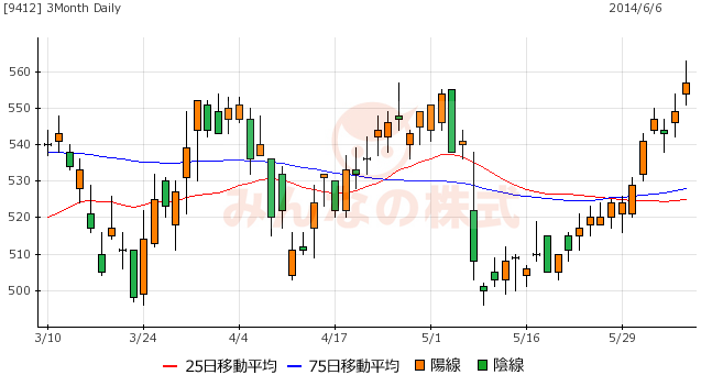 2014/06/08 - 正坊さんの株式ブログ。タイトル:「典型的なボックス圏 スカパーJSATHD(9412)」 本文:半年ほど前に【9412】スカパーJSATホールディングスを買ったのですが、ここしばらく上は550円台、下は500円前後できれいなボックス圏相場になっています。アタシが買ったのは524円なので、含み損と