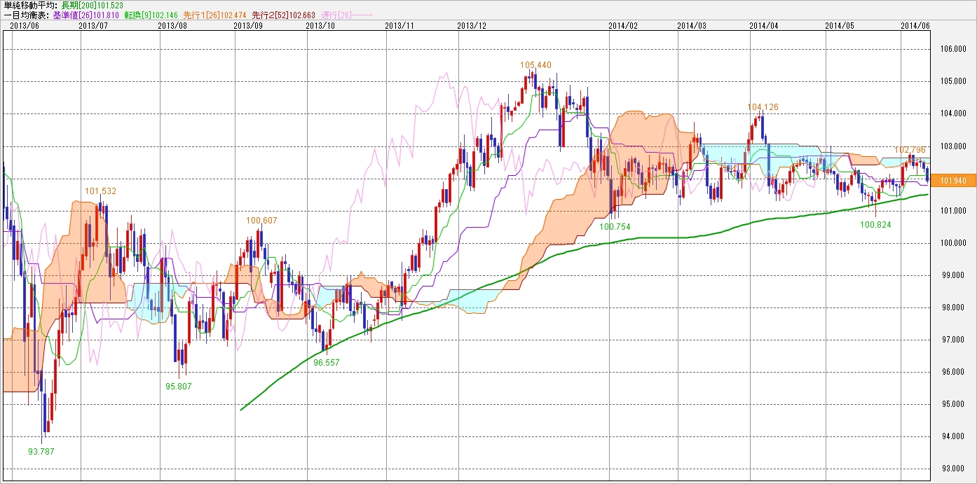 一言で表現すると現状は非常にヤバそうです。チャートを見る限り、102円台を割り込んで101.80円( 一目基準線)近辺で下げ止まっていますが、もし押し目の動きがあるのであれば、即座に102円台まで反発してもおかしくない程度の動きだったと思われます。