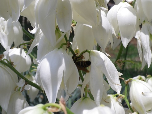 ↑ 駒沢公園で見つけたなんだか不明な花。ハチが一生懸命にお仕事中