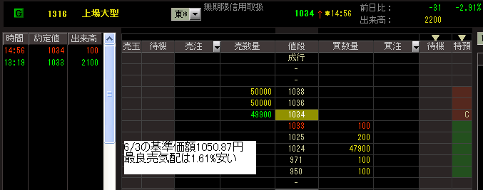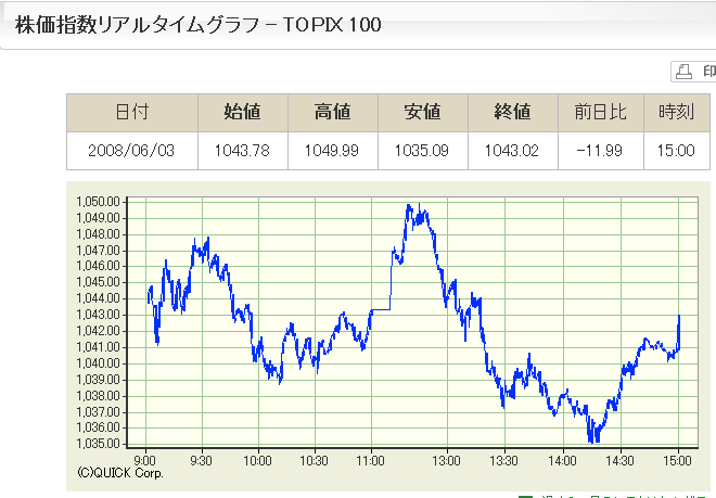 2008/06/03 - miyakenさんの株式ブログ。タイトル:「上場TPX100大型ETF(1316)が安い」 本文:今日は大型ETFの売り気配がフェアバリューより安い状態が続いていました。大引けではNAVより1.61%安でした。