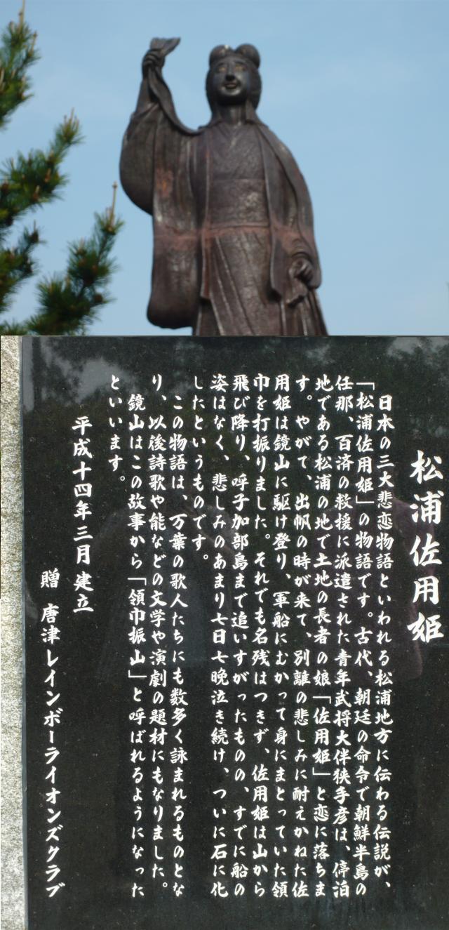佐用姫の銅像があります(写真左上)物語のあらすじは、恋人が、朝廷の命令で朝鮮半島の救援に派遣され、別離の悲しみに耐えかねた佐用姫は山から飛び降りて追いすがり、七日七晩泣き続けついに石に化した(写真左下)