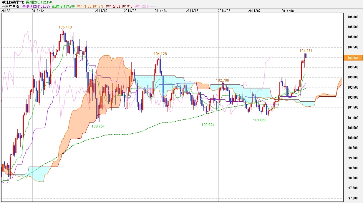 2014/08/25 - ゆきママさんの株式ブログ。タイトル:「ドル円は7ヶ月ぶり高値水準だが反動には警戒したい」 本文:先週のFOMC以降流れが大きく円安・ドル高に傾き、ついに1月23日以来の水準に突入していますヽ(*´∀`)ノオォォォ♪