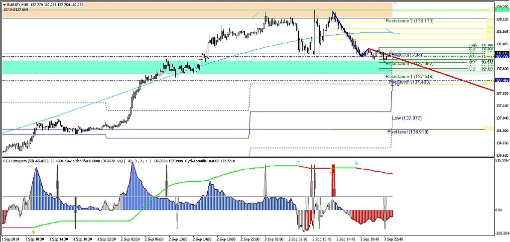 2014/09/04 - けろけろさんの株式ブログ。タイトル:「2014-09-03 15分足」 本文:昨日までの動き左から (チャートの時間は7時間程度遅れてます)--ユーロドル-- --ユーロ・円--