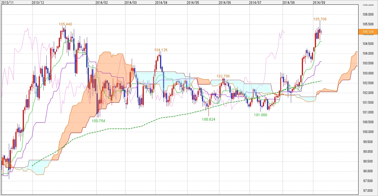 こうしてみると攻防のポイントとしては、上は年初来高値のある105.60~105.70円を中心にピボットやボリバンといったテクニカルラインが集中しています。下は一目転換線やピボットが104.50~104.60円近辺にある状態です。