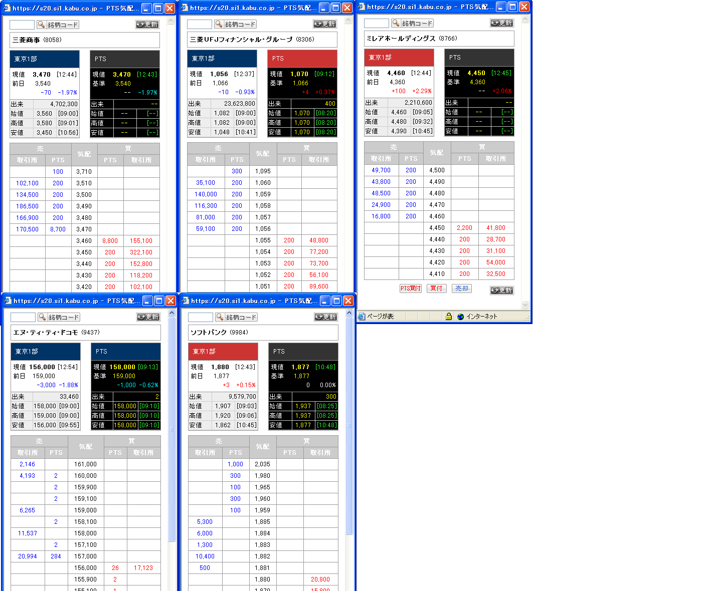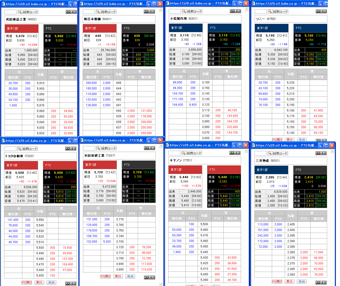 5日にリリースされた「複板PTS」を主要銘柄について調べました。本日12時40分ごろの板情報です。