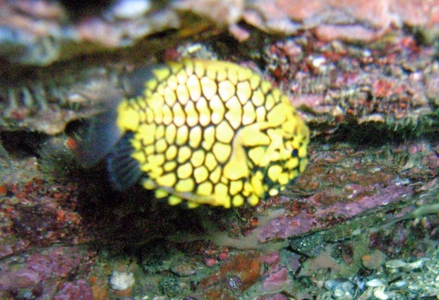 樹木の松っ♪マツボックリに似ている黄色(金色)に輝くボディの持ち主っ♪動きも遅く、怖がりさんなんで、岩の奥に隠れてまつ♪