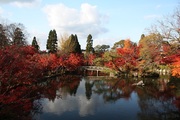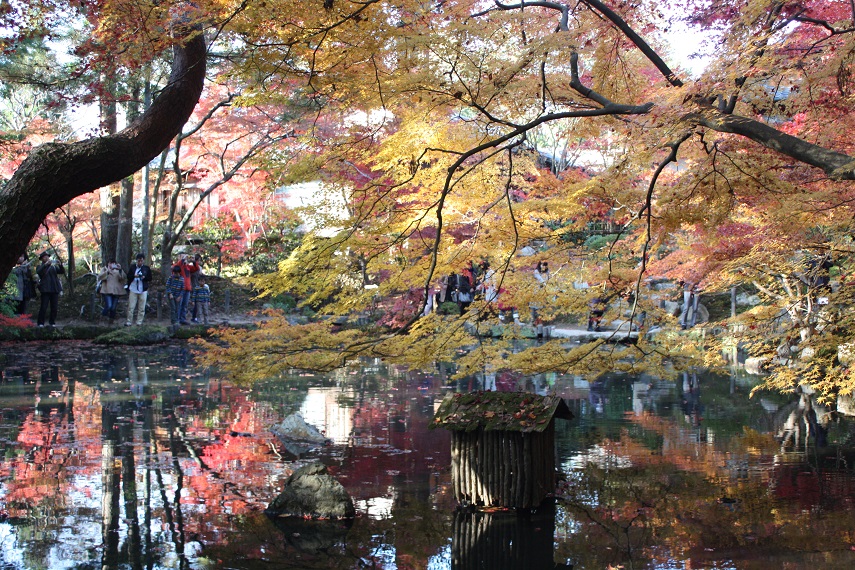 池の水面に映る紅葉 ガラスに映る「ガラス紅葉」