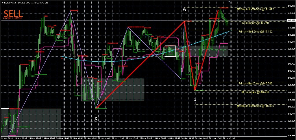 拡大型トライアングルにおけるX波とD波が、修正波として上昇するときは、ともに