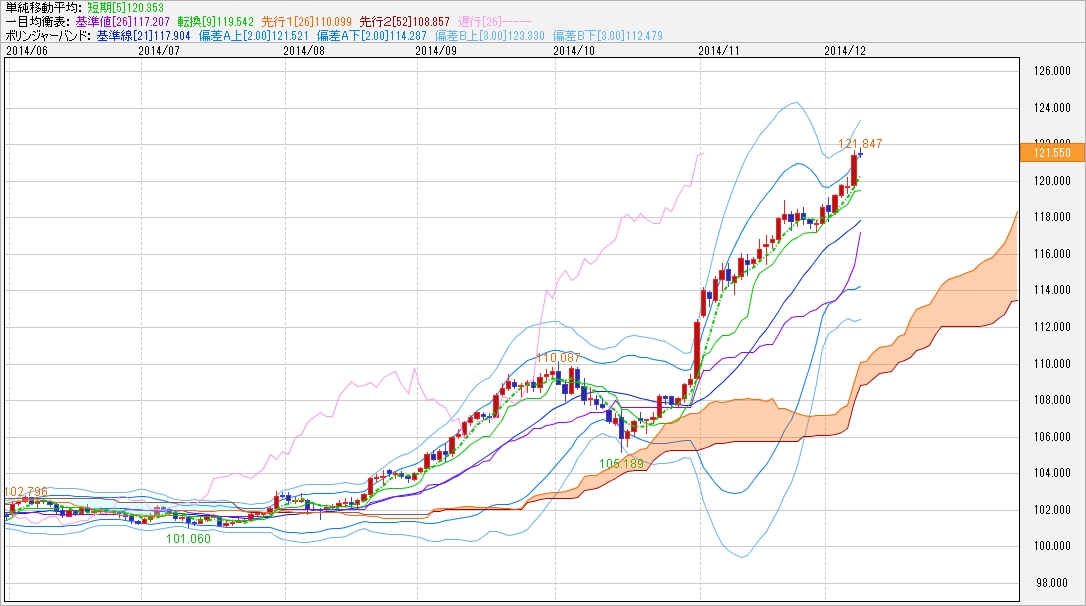 ↑ドル・円の日足チャート。5日移動平均線一目均衡表ボリバン