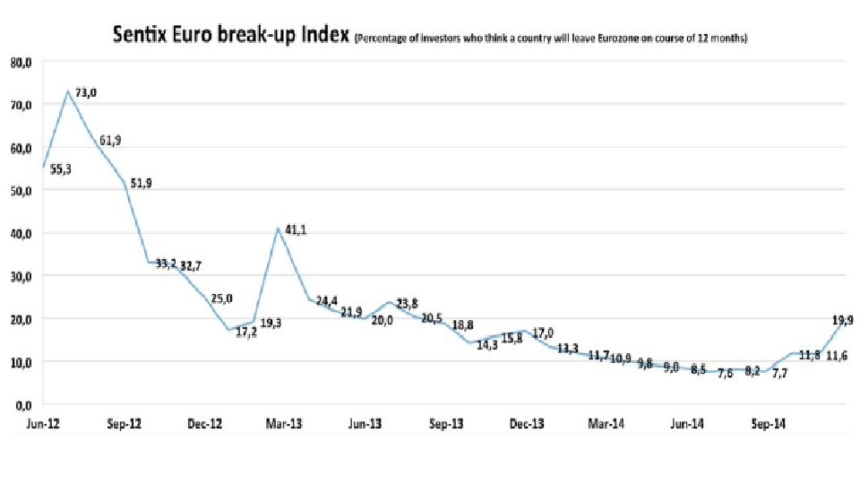 2015/01/03 - jojuさんの株式ブログ。タイトル:「Euro Break-up Index」 本文: ちょい上げ。 金融政策の前では財政出動も選挙も大した影響を持たない。 ECBの量的緩和十分化にはドイツ国債購入がおそらく必要。 ここがキモ。