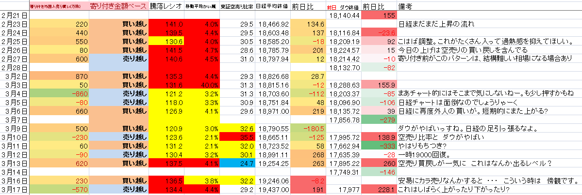 2015/03/17 - たか○さんの株式ブログ。タイトル:「データ更新」 本文:思ったより空売りが買い戻されてる。うまくそんぎらされた、というところか。この雰囲気はこういう損切りを誘う繰り返し。餅つきぎみだ。しかし今日はFOMAC。だっけ。まあ流れが変わるかもしれませんの―。