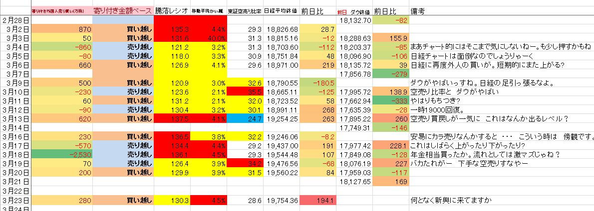 2015/03/23 - たか○さんの株式ブログ。タイトル:「データ更新」 本文:なんとなーくですが、 日経は強いけれどさすがに上値は限られてくる。そして、それでも決算相場までは時間がすこーしある。来ますね。新興というか少し来てますね。という感じで見ています。