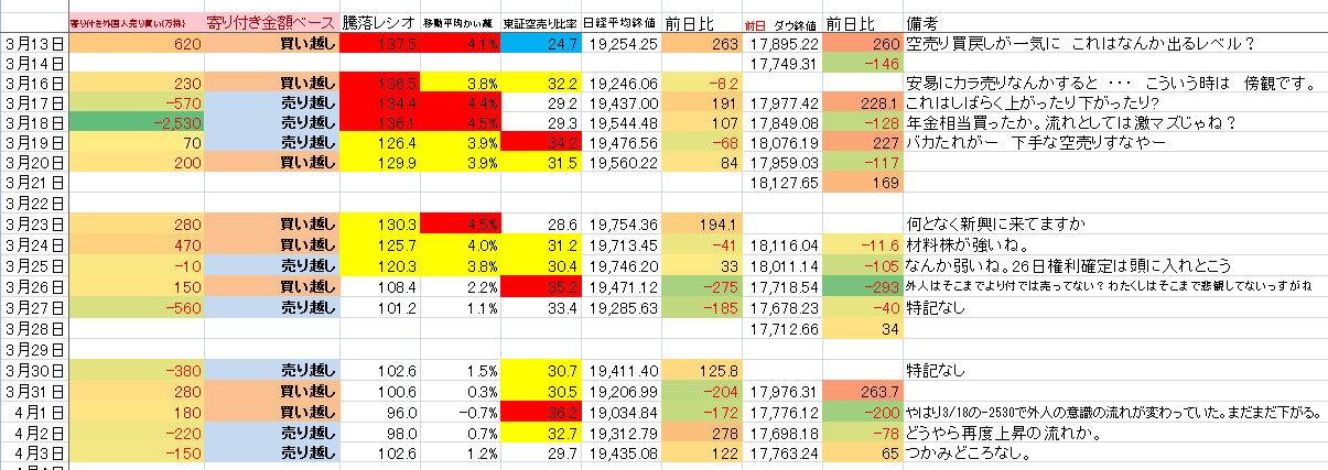 2015/04/05 - たか○さんの株式ブログ。タイトル:「でーた忘れ」 本文:まあこの状況だとデータなんてくそですわ。上に行くか、あるいは調整するか。どっちか全くわからん状況。上がっては下がって。結果ヨコヨコな感じっすかね。こういうときは