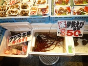 市場内は人でいっぱい    買った食べ物をここで食べます 海産物も