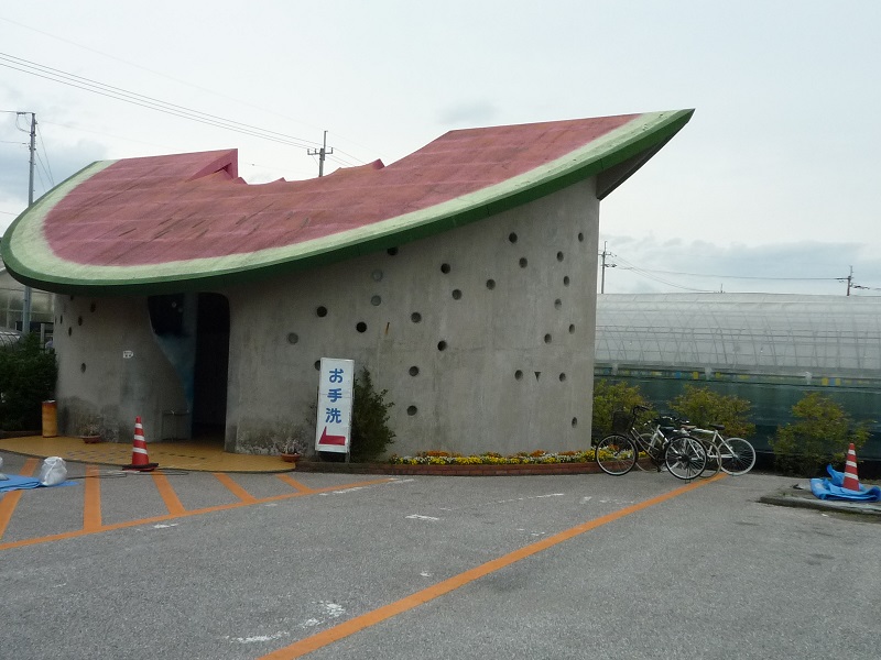園芸農家が集まった西島園芸団地 トレードマークのスイカのトイレ  ブーゲンビリアが咲いてます