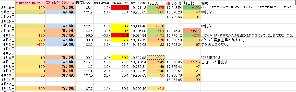 2015/04/13 - たか○さんの株式ブログ。タイトル:「データ更新 でおじゃる」 本文:今日は久々の時間内更新。しかし特記事項なし。相場としては落ち着いた相場だ。過熱感もない。下落の恐怖もない。しかし上昇の強い力も、少し隠れた感じ。なくなったわけじゃないと思うけど。決算相場への突入直前で