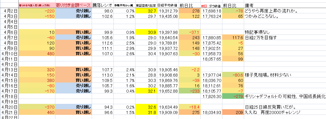 2015/04/21 - たか○さんの株式ブログ。タイトル:「データ更新」 本文:データ更新します。思ったよりも日経上がりましたね。明日はどうでしょうか。20000を底固めしてほしいっすね。