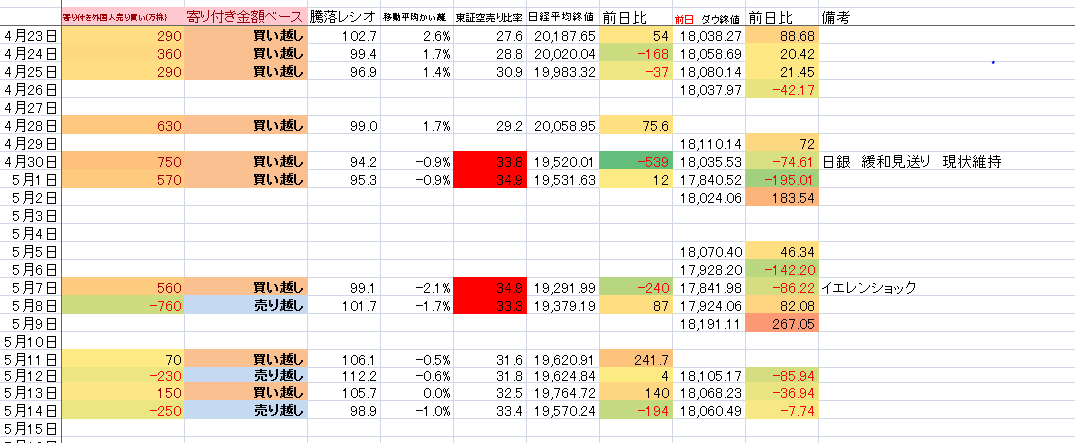 2015/05/14 - たか○さんの株式ブログ。タイトル:「データ 更新」 本文:上がると下がり、下がると上がる。明日は上げ?だろうか。相場に意思が感じられんね。