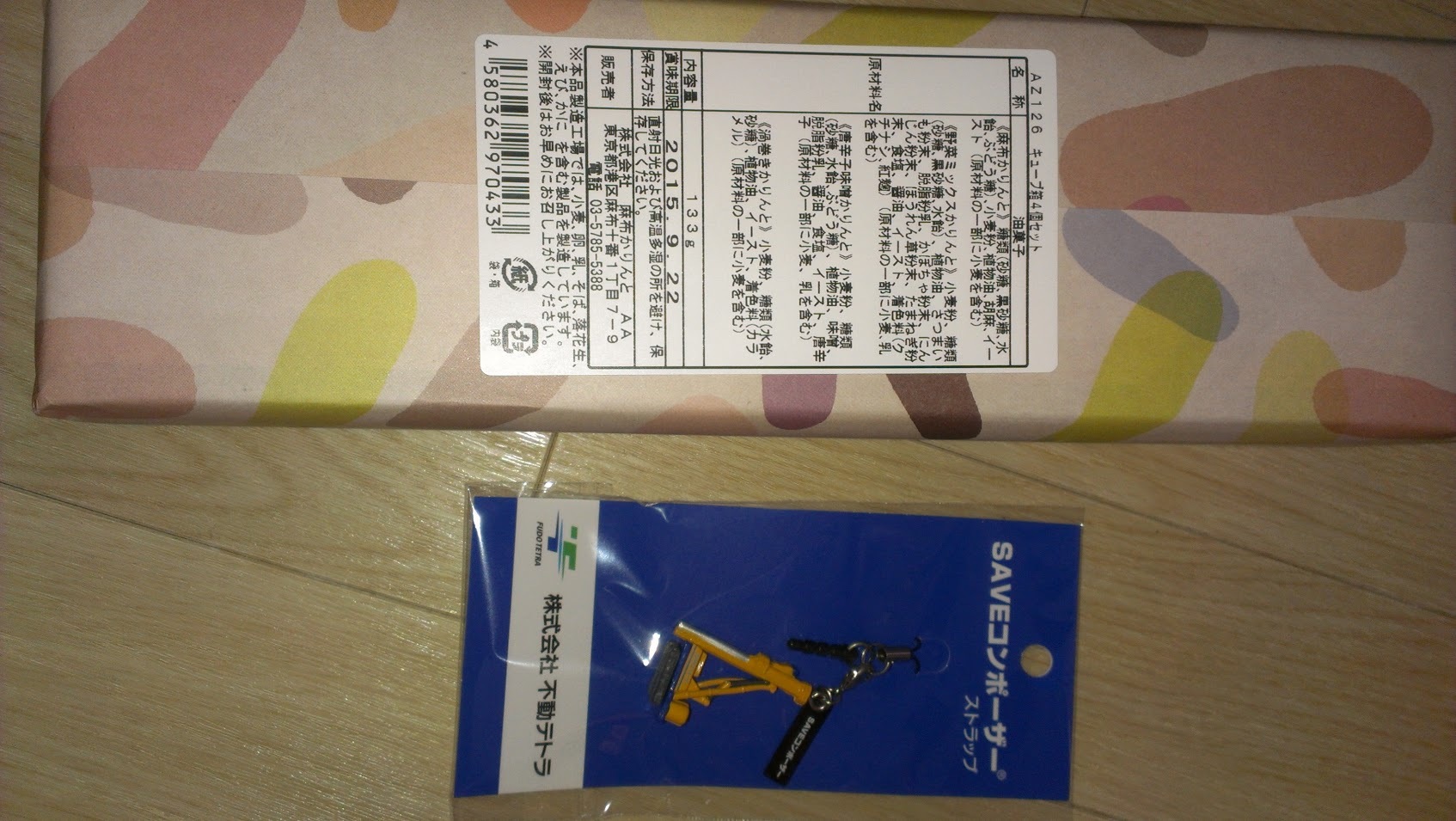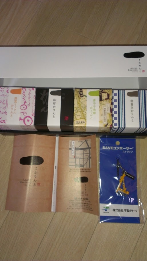 お土産:麻布かりんと詰め合わせ+重機のキーホルダー +会場でパックジュース