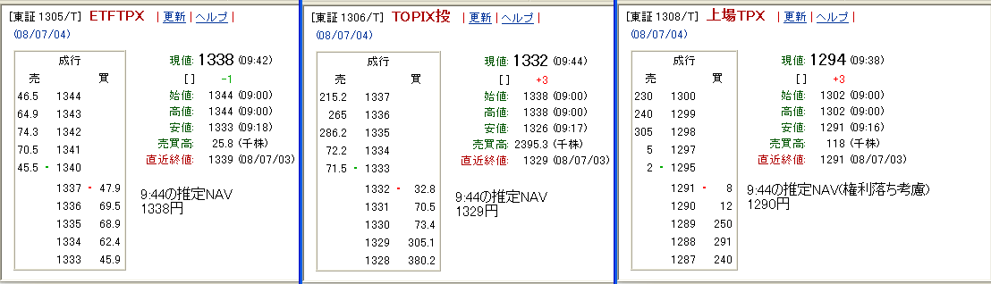 2008/07/05 - miyakenさんの株式ブログ。タイトル:「権利付最終売買日のETF」 本文:1305と1306は7/4が権利付最終売買日、1308は既に権利落ちしました。 画像は、ザラ場の板とそのときのNAVです。 1306はいつもより高い感じです。