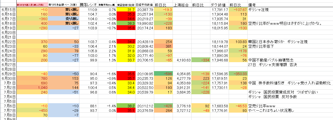 2015/07/08 - たか○さんの株式ブログ。タイトル:「一覧表一部訂正」 本文:これまでは 日経平均 ダウのみの記載でしたが、現状中国を無視できないということで 上海総合をねじ込みました。また、これまでは 前日のダウの終値を書いていましたが、同日にする方が解りやすいので