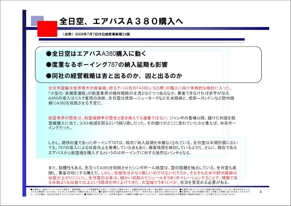 また、話題性もある。先立ってA380を就航させたシンガポール航空は、空の話題を独占している。全日空も追随し、集客の柱にする構えだ。しかし、収益性はかなり厳しいのではないだろうか。そもそも北米や欧州路線は収益が上がりにくいし、全日空の沿革は、細かい就航スケジュールをうまくオペレーションすることで、規模で劣る日航よりも収益では上という図式を作り上げてきた。大型機でうまくいくか。状況を見定める必要がある。