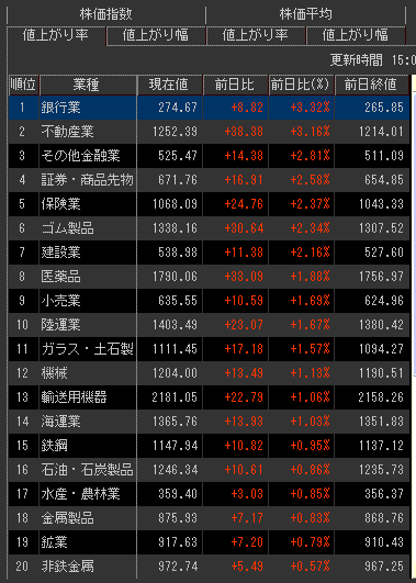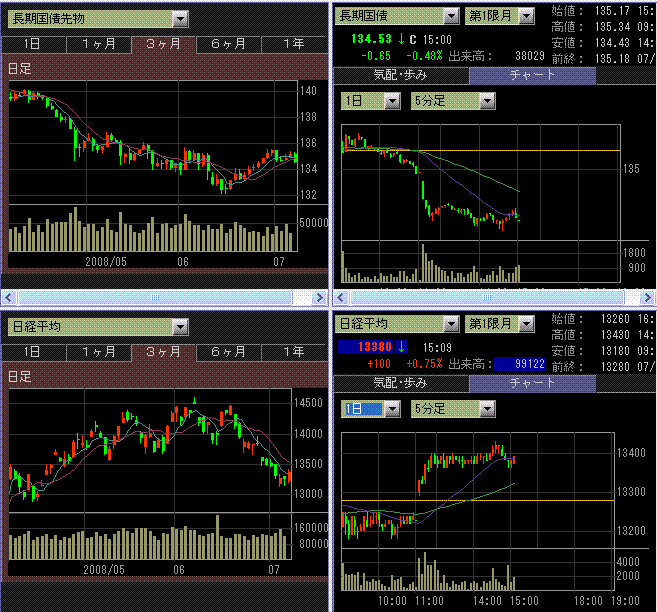 日経平均は、前場は前日比マイナスで推移しましたが、後場寄りから先物に買いが入って上昇に転じました。アジア株高と円安をきっかけに、CTAが株先物買い・債券先物売りをやった感じです。12営業日続いた日経平均の続落記録はついにストップ。業種別では、銀行、不動産、保険、証券あたりが強かったです。この辺の業種は同時に動く傾向がありますね。東証一部出来高は17億株台、売買代金は1.8兆円。原油価格は、夜間取引で143ドル台まで下落しています。