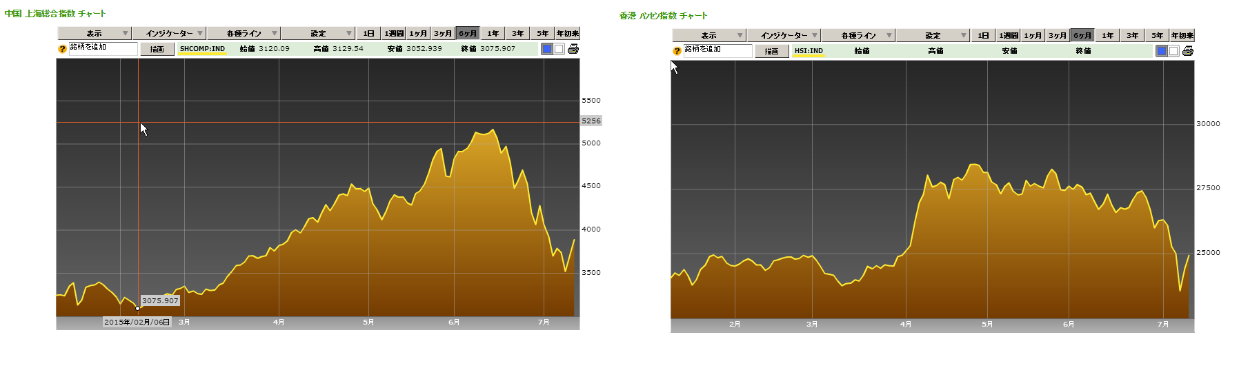 香港ハンセン指数については年初来最高値の2015年4月28日の28,442.75香港ドルから2015年7月8日に23,516.56香港ドル(▲17.3%)まで暴落。ただし急落が起きたのは6月24日から。
