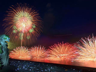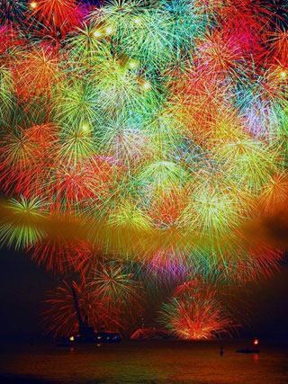 沖合400mのイカダに三尺玉を仕掛けてそのまま爆発させるもので、海面に直径600mの美しい半円が広がる。
