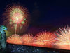 走っている2隻の船から花火玉を次々と海に投げ入れる「海上自爆」では、全速力で走る船を追いかけるように花火が開いていくのでスリルも満点。