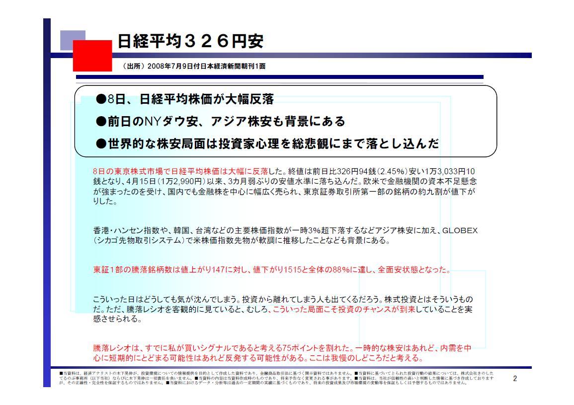 2008/07/10 - 木下 晃伸さんの株式ブログ。タイトル:「【投資脳のつくり方】日経平均326円安」 本文:みなさま、いかがお過ごしでしょうか。 経済アナリスト、木下 晃伸(きのした てるのぶ)です。 ●帰国 中国出張は実のあるものとなりました。