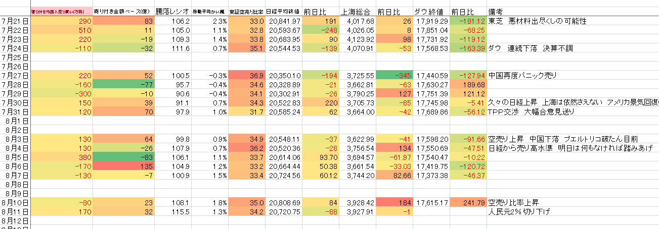 2015/08/11 - たか○さんの株式ブログ。タイトル:「お盆特有の変な相場?」 本文:一時20,900付近だった株価が 中国人民元2%切り下げで降下。20600付近まで売られた。むむむ。このニュースはでかいニュースだが、こんなんであんなナイアガラを引き起こすとは。中国不安が原因と