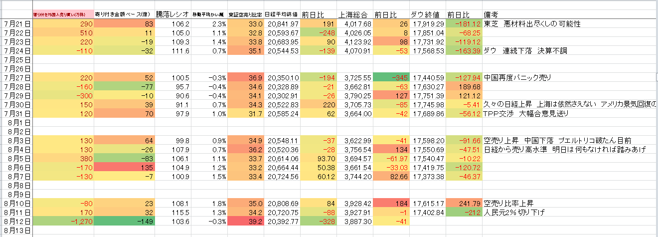 2015/08/12 - たか○さんの株式ブログ。タイトル:「更新します」 本文:プラス要因として 空売り比率が異常に高いマイナス要因として