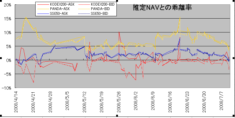 2008/07/10 - miyakenさんの株式ブログ。タイトル:「中韓ETFの気配値と推定NAVとの乖離率」 本文:KODEX200上場指数投資信託 【東証:1313】 上場インデックス中国A株(パンダ)CSI300 【東証:1322】 上海株式指数・上証50連動型上場投資信託 【大証2部:1309】