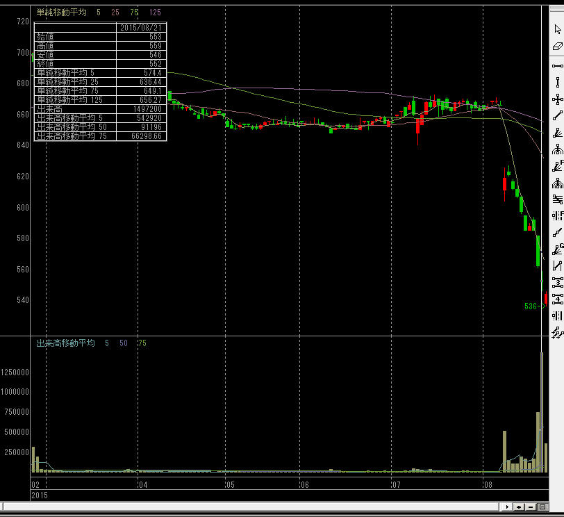 結果はこの画像のような値動き。ただ、今回は分売発表後の10日からいきなり売るのではなく、12日の612円から空売りをした。理由は火曜の逆日歩を確認したかったという点と、分売発表翌日の寄り付きから売ると、寄り底になる事が多いという点があるので。今回はお盆を挟むので値決めまで長めというのも理由の一つ。